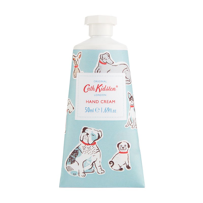 Cath Kidston Squiggle Dogs Hand Cream Presented in a pastel blue tube that is designed to look like an artist?s tube of paint, this moisturising hand cream from Cath Kidston is made with all natural ingredients to be kind to your skin every day. Containing a formula of shea butter, cocoa butter, glycerin, aloe vera leaf juice and vitamin e, this scented hand cream is a marvellous moisturising solution for hands that need some love and care.