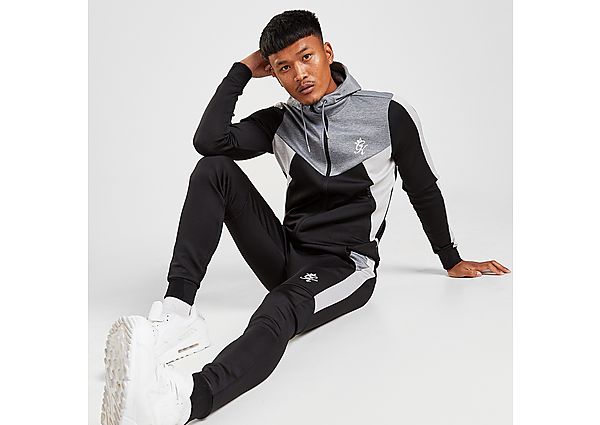 Level up your look and suit up in this men’s Koen Tracksuit from Gym King. In a black and grey colour block design, this regular-fit suit is made from smooth and stretchy poly fabric. It features a full zip hoodie with an adjustable hood, as well as matching track pants with ribbed cuffs and an elasticated waistband for a custom fit. With side pockets, this tracksuit is finished with signature Gym King branding to the chest and thigh. Machine washable. Our model is 5’11” with a 36.5″ chest and wears a size medium.. Material: 92% Polyester/8% Elastane