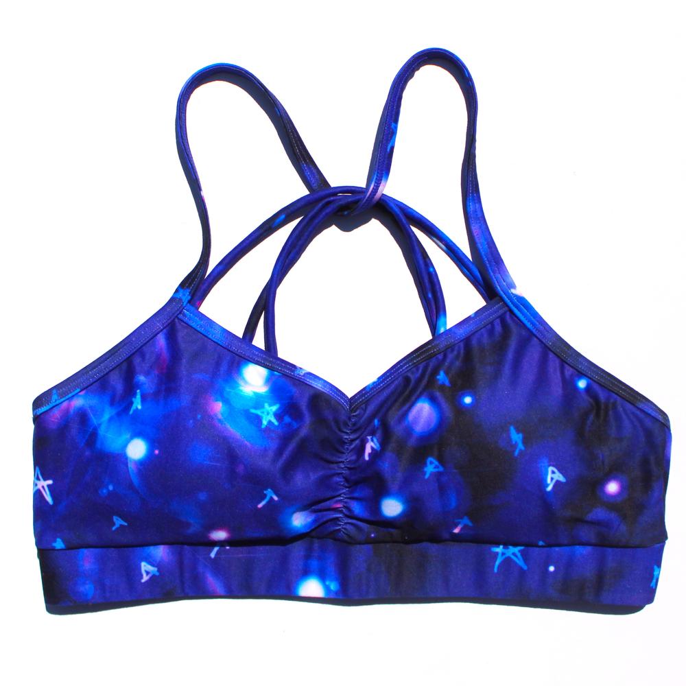 Beautiful feature back design with star criss cross straps Eco-friendly material made from recycled plastic bottles Super luxurious soft fabric, blended with spandex for maximum comfort Lightweight and flexible material with gorgeous purple lining. Printed in labels for comfort, and to protect the environment